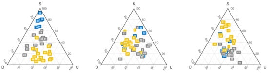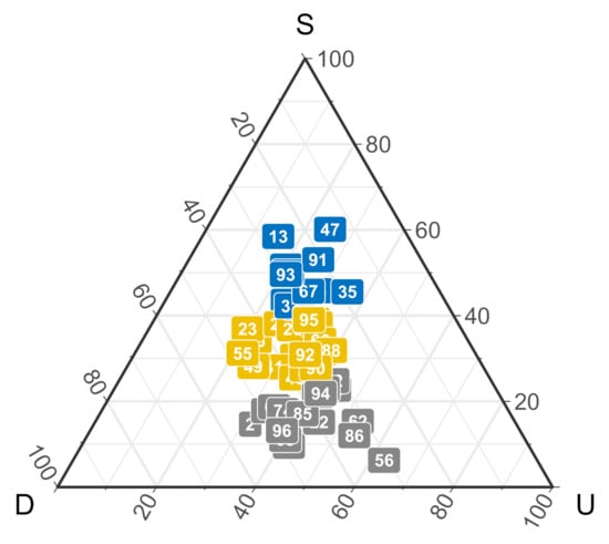 The ternary figure describes participants’ proportion of different strategies in the non outcome-based group. Each color represents a cluster group based on players’ action proximity. S, stay; D, downgrade; U upgrade.