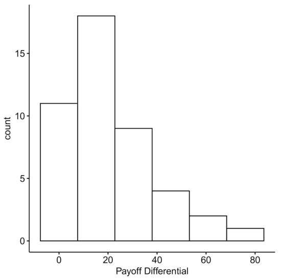 Nevertheless, we present data on the extent to which players may have exploited (or were exploited by) their opponents. Figure 5 shows the distribution of the win count differentials within a dyad and Figure 6 presents the resulting payoff difference. Many of the dyads’ win count differences are centered around 10 points (), indicating the members were equally likely to win over 100 trials, resulting a payoff difference centered around 20 points (). Given that few individuals within a pair seem to exploit their opponents, and that individuals within a pair are largely equivalent in terms of win counts and payoff differentials, we explore the dyad-level strategies more directly in Experiment 2.