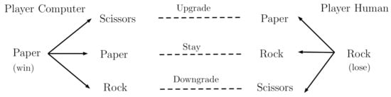 Our dependent variable was the proportion of choices of each type (rock, paper, and scissors) made by each player over the 100 trials, and the cycling behaviors (upgrade, downgrade, and stay; Figure 1) after each choice. We used JASP [18] for a repeated ANOVA analysis (Greenhouse–Geisser Correction for Sphericity where appropriate).