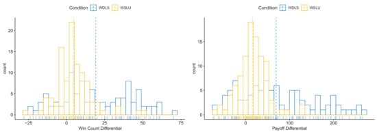 We first investigated whether players were able to exploit computer opponents. Figure 8 (left) shows the win count differentials between human players and computer algorithms (). Here, the positive win count refers to humans successfully exploiting their assigned computer algorithm. The negative win count indicates that computer exploited the human players. In both conditions, WSLU () and WDLS () human players exploited their computer opponents. We also noted that human players in the WDLS condition win more compared to those in the WSLU condition (). Correspondingly, players in both WLDS () and WSLU () conditions earned more points than their paired computer opponents (; Figure 8, right). In addition to the relative gains within each dyad, players in the WDLS condition generally won more points than players in the WSLU condition ().