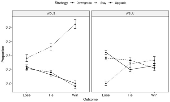 To further interpret the three-way interaction, separate analyses of strategies and outcomes were conducted on WDLS and WSLU using a repeated ANOVA. In the WDLS condition, there was a main effect of strategy () and an interaction with the outcome (). Players chose to stay more after a win compared to downgrade () or upgrade (). After a tie, the differences between stay and downgrade () and stay and upgrade () were also significant. The preference of choosing strategies after a loss is not significant. In the WSLU condition, there was only an interaction between the strategy and outcome (): after a loss, players chose to stay compared to downgrade () or upgrade ().