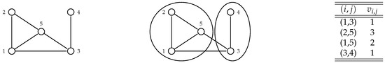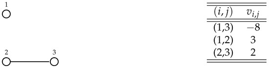 Let us consider the graph G depicted in Figure 7 and the valuation function v whose non-null values are listed in Figure 7, and in which and .