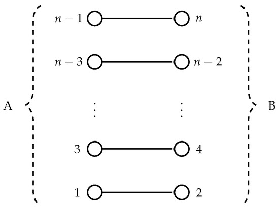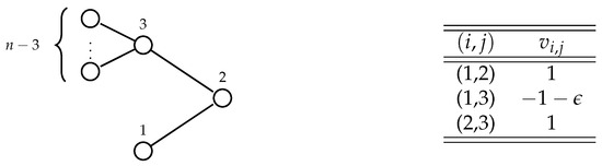 Consider the bipartite graph with n vertices depicted in Figure 5 (note that and ), and let v be the valuation function such that