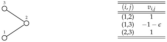 We first show that the social context radically modifies the notion of stability of additively separable hedonic games. To this aim, consider the instance whose graph G and valuations are depicted in Figure 2. On the one hand, the coalition structure is Nash stable when (i.e., without considering social effects): the utility of players are , respectively. Player 1 is earning as much as possible, and therefore has no incentive to deviate; player 2 would obtain a utility of 2 by joining the coalition of player 3, while it would obtain a utility of 0 by going alone; player 3 would obtain a utility of by joining the coalition of players 1 and 2. On the other hand, the same coalition structure is not Nash stable when , i.e., when considering the effect of social context. In fact, in this case the utility of player 2 is again , while she would obtain a utility of by joining the same coalition of player 3. Interestingly, it is also possible to build an instance in which the converse does not hold: Consider the instance exploited in the proof of Theorem 2. Here, the grand coalition is Nash stable and is such that every player is getting a negative utility. If we do not consider social context effects on the player utilities, the grand coalition would not be Nash stable because every player would clearly prefer to form a new coalition alone, so getting utility 0.