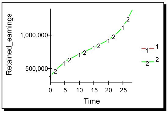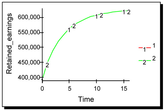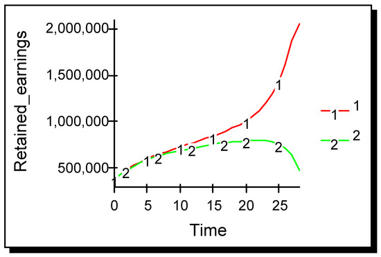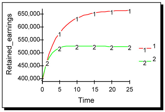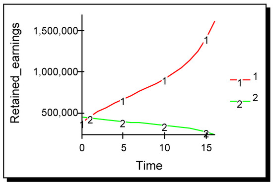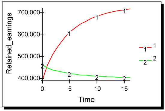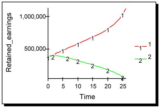 The simulation model then computes price elasticity and advertising elasticity of demand and determines the optimal level of advertising using the Dorfman–Steiner condition [30]. The shift in demand due to this advertising is then computed using the Friedman–Cellini–Lambertini [26,27] expression (3) above and the reservation price incremented accordingly. In the next time period, a new competitive situation exists with new inverse demand functions facing the two firms. The Cournot Nash equilibrium is computed for this new competitive situation, giving optimal quantities, prices, and profit figures for the two firms. This in turn leads to a new computation for elasticities, optimal advertising, and consequent shift in demand, and so the simulation continues. No stopping rule is applied: the simulations were allowed to continue until firms showed either exponential growth or came to an asymptotic equilibrium. See [35] for a discussion of the feedback loops inherent in the simulation model.