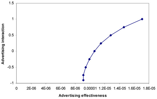The relationship between spillover and advertising effectiveness when advertising is symmetric is now examined. Trial and error experimentation determined that the bifurcation point—the level of advertising effectiveness at which industry behaviour switches from asymptotic growth to exponential growth—increases as advertising interaction increases, as shown in Figure 9. This implies that, as advertising becomes increasingly cooperative, firms must become increasingly more effective at advertising in order to generate a substantial increase in demand. Industry performance when advertising is cooperative is lower than that when advertising is non-cooperative.