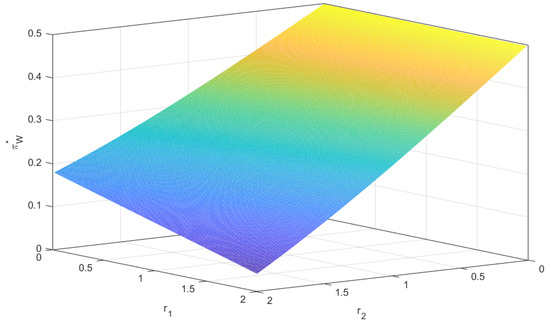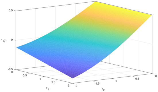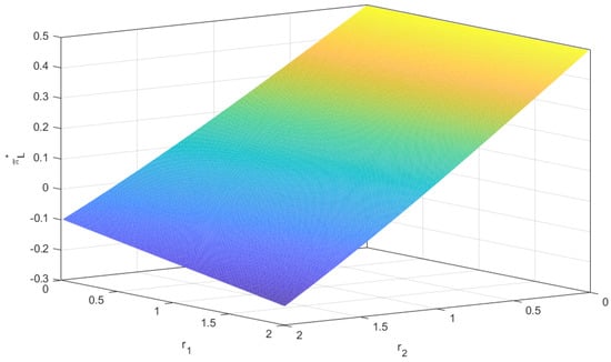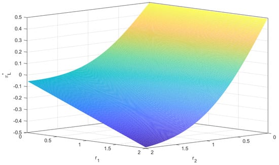 Figure 4, Figure 5 and Figure 6 illustrate the first-stage loser’s equilibrium expected payoffs for the three example values of ranging over and . These relationships are similar to those for but are easier to visualize, as for all and , and for all and . The bigger issue revealed by these graphs is that can be negative for a variety of parameter combinations, which brings into question whether or not the parties will necessarily want to participate in the conflict.