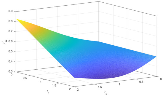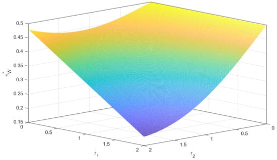 To show why participation may be an issue for some parameter configurations, we present three-dimensional graphs of and as and range from just over zero to two (our previously assumed ranges, and the ranges for unique interior solutions to exist in standard contest models). We provide three graphs for the equilibrium expected payoff of each party, one with , one with , and one with , to show how the relationship with the CSFs’ parameters changes with a lower reward to the first-stage winner (higher ) vs. a higher reward (lower ).