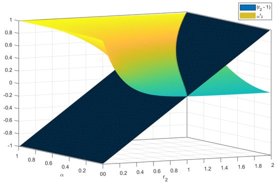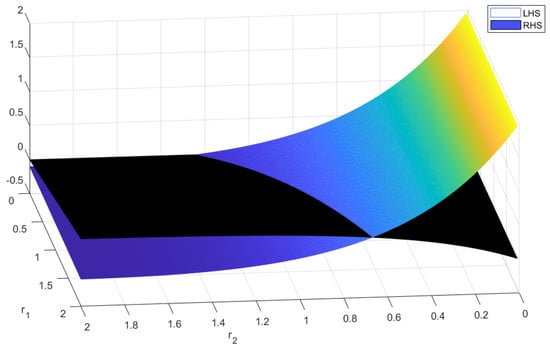 The condition under which such an expected Pyrrhic victory arises depends upon the values of all three parameters (i.e., , , and ). Figure 8 provides a plot of the left- and right-hand sides of condition as functions of and for . Condition is satisfied—so that the first-stage loser realizes an expected Pyrrhic victory—when the black surface lies above the multi-colored surface.