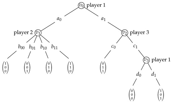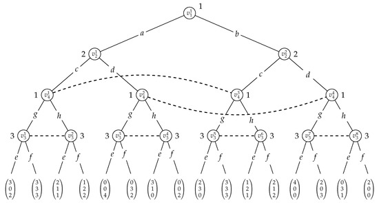 A strategy for player i in an extensive-form game is a function such that for all . The set of strategies available to player i we then denote by . A strategy profile is then a sequence of strategies, one for each player. Let . Then, every strategy profile defines an action profile such that and where i is a player who is active at v. Observe that a strategy profile also defines a unique path from the root to a leaf with history defined such that, for all , edge is associated with action , where i is the player who is active at . Finally, we have for each player i a utility function associating each strategy profile with a real value such that .
