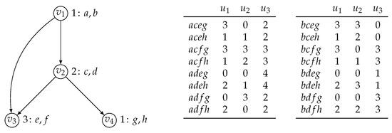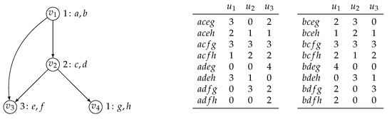 Consider the three-person partial order game depicted in Figure 3, with the directed acyclic graph it is based on given on the left. To the right of each vertex v, we have indicated the playerand the actions they have at their disposal at v. For instance, at vertex, player 2 can choose among the actions c and d. If all players make a choice at their respective vertices, an action profile results, which then is associated with a utility value. For instance, if player 1 chooses a atand h at, player 2 chooses c at, and player 3 chooses f at, the action profile(also denoted by) results, yielding utility values of 1 to player 1, and 2 to players 2 and 3. The table on the right summarises the utilities the players get under the different action profiles that may be played. Note that in this game there arepossible action profiles.