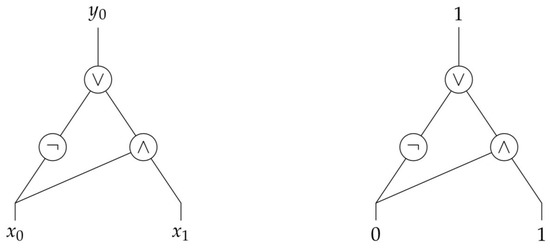 A Boolean circuit is commonly depicted as a directed acyclic graph , with the gates as vertices, that is, , and whenever and for some . For examples of Boolean circuits, also see Figure 3 and Figure 4, below.