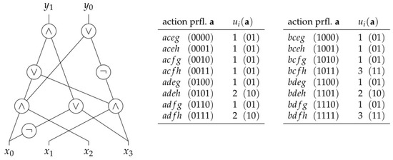 Recall that , , and . Let the local indices of a, c, and e be given by 0, and those of b, d, and f by 1. As , any action profile can be represented by two Boolean variables and , where the value of represents the choice for a or b at , the value of the choice for c or d at . For instance, the action profile can thus be represented by setting to 0 and to 1. For these values the circuit evaluates to 1, which corresponds to and as depicted in Figure 4.