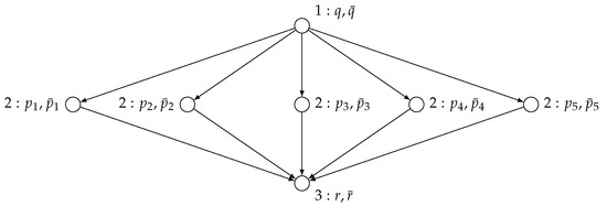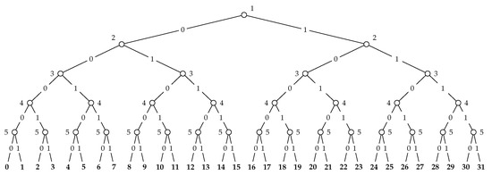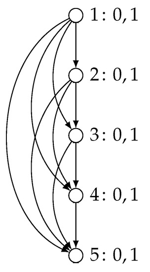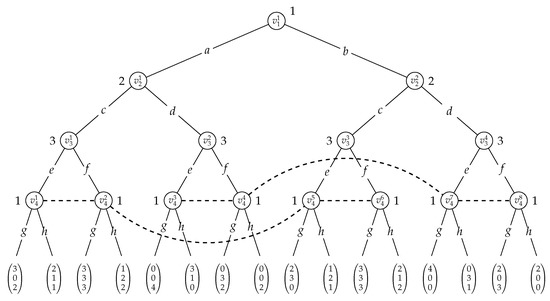When representing partial order games concisely, we assume that for distinct vertices v and w the action sets and are disjoint. Having assumed to be non-empty for each vertex v, it thus follows that . For ease of presentation, we also assume that is an integer power of 2 for each vertex v. In this section, we assume that for each vertex v, the elements of set are enumerated as , thus associating each action with a unique local index k at v. Let denote the binary representation of the local index k, using exactly digits. Thus, if , we have .