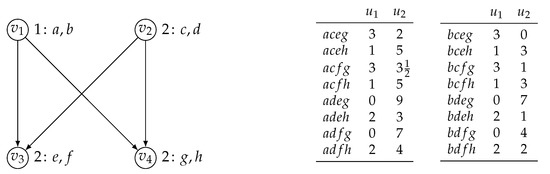 Figure 5 illustrates how a utility function for a player i in the game of Example 1 is represented by a Boolean circuit. The utility function is depicted on the right. We assume that the local indices of a, c, e, and g be given by 0, and those of b, d, f, and h by 1. As , an action profile in is thus given by means of an assignment to four Boolean variables , , , and , representing the choices at the vertices , , , and , respectively. For instance, action profile is represented by setting variables and to 0, and variables and to 1, which can thus also be denoted by the binary string 0011. Evaluating the circuit for these values, we find that is set to 0 and to 1. This corresponds to and . Observe that the Boolean circuit can be evaluated in time polynomial in its size and that it is exponentially smaller than the explicit tabelling of the utility function on the right.