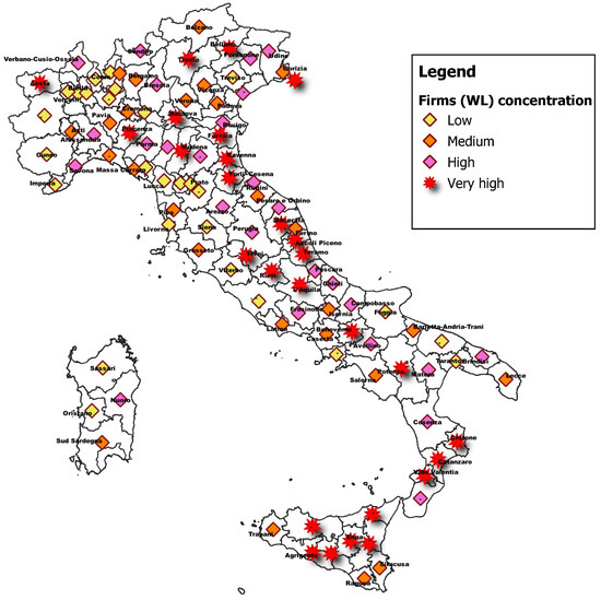 Concentrations of firms (WL). Source: Authors processing of AIDA Bureau Van Dijk and Prefectures data.