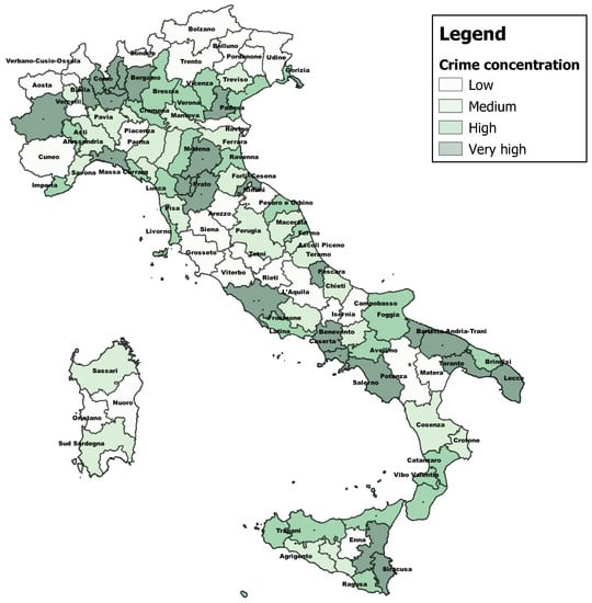 Concentration of the organised crime variable. Source: Authors processing of AIDA Bureau Van Dijk and Prefectures data.