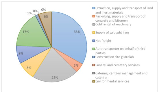 In addition to the localisation, using the classification of sectors proposed in Section 2.1, we analysed the sectoral concentration of the WL firms. From Figure 3 it is clear that most firms are focused in the sectors: Extraction, Supply and Transport of Land and Inert Materials (33%), Cold Rental of Machinery (22%) and Auto transporter on Behalf of Third Parties (17%).
