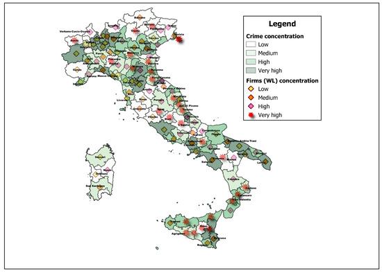 Organised crime variable and concentrations of firms (WL). Source: Authors processing of AIDA Bureau Van Dijk and Prefectures data.