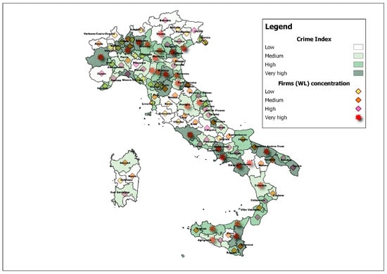 The initial idea in this work was to verify whether the greater concentration of firms (WL) was localised in those areas with the greatest organised crime rate and therefore to suppose that the “White List” was a valid tool for firms to speed up the procedures for participation in public tenders. To develop this idea, we thought of combining the two variables of Crime and concentration of companies (WL). The result obtained can be observed in Figure 4, from which it clearly emerges that the initial hypothesis is not entirely confirmed. In fact, we find the highest concentration of firms (WL) in those territories where the concentration of crime is lower, except for the provinces of the Apulia region (in particular Crotone, Catanzaro and Vibo Valentia) and the Sicily region (Messina, Palermo and Catania). The legal certification is required to participate in public procurement races in provinces with a high crime rate. This implies that enterprises participate in public tenders in provinces other than those in which they have their registered office. The latter hypothesis will be the result of the development of this work, when we will verify where the subjects participating in public tenders actually operate. It might be interesting to check if firms placed in territories with a low criminal index participate in public tenders promoted by contracting authorities placed in highly criminal areas.