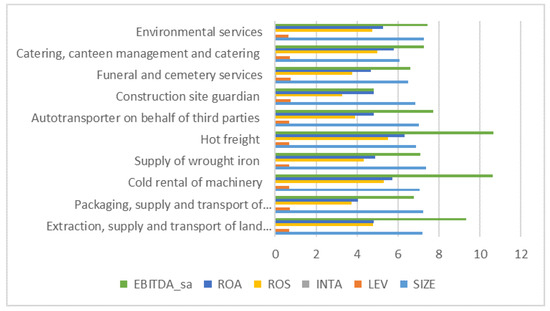 A first interesting result was obtained by analysing firms (WL) in the 2013–2020 period by type of activity (Entrepreneurial activities for which registration in the Prefectizio list is possible, indicated in Article 1, paragraph 53, of the aforementioned Law 190/2012) (see Figure 6). Figure 6 shows clearly that all the indexes show similar trends. The variable EBITDA/Sales shows higher values in the sector: Extraction, Supply and Transport of Land and Inert Materials; Cold Rental of Machinery and Hot Freight. The average value of Ebitda/sale in these sectors is around 10% demonstrating that, on average, in these sectors companies show a sufficient level of profitability, while the other sectors vary between 4% and 7%, showing a poor level of profitability. We also observe Financial Leverage (LEV) and note values between 0.6 and 0.7, highlighting a low debt exhibition for companies (WL). Even the profitability indices show almost the same trends in the various sectors. Obviously, to have a vision as complete as possible on the structure of the firms we will never be able to rely on the analysis of individual indexes without comparing them and analysing them together.
