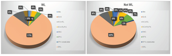 Indeed, if we observe the distribution of the two samples organised by legal form (Figure 7) we can observe that the (WL) are mostly composed of limited liability firms (77%) and only 3% of joint stock firms. While the “Not WL” have a greater presence of joint stock firms (8%) and 69% of limited liability firms. Therefore the greater “size” (albeit minimal) (see Table 2) of the “Not WL” is demonstrated by the greater presence of firms with greater registered capital.