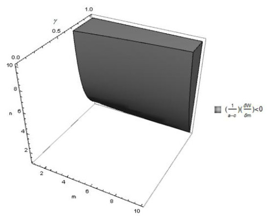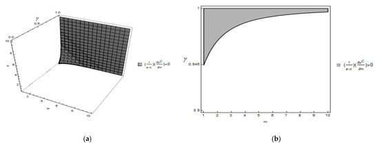 It follows from Figure 1a,b that if the products are not close substitutes (i.e., ), there is a negative relationship between m and the R&D investment of each technology leader. On the other hand, if the products are perfect substitutes (i.e., ), there is a positive relationship between m and the R&D investment of each technology leader, as . However, if the products are close substitutes but not perfect substitutes, the relationship between m and the R&D investment of each technology leader is positive for lower values of m, but negative for higher values of m, thus showing an inverted-U relationship between the number of technology followers and the R&D investment of each technology leader. As the number of technology leaders is independent of the number of technology followers, the number of technology followers and the aggregate R&D investments of the technology leader will also show an inverted-U relationship.