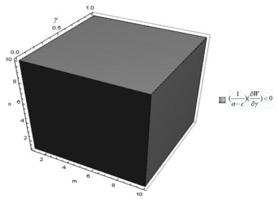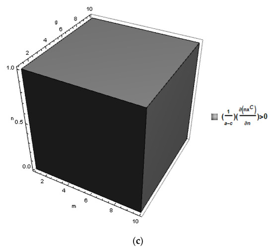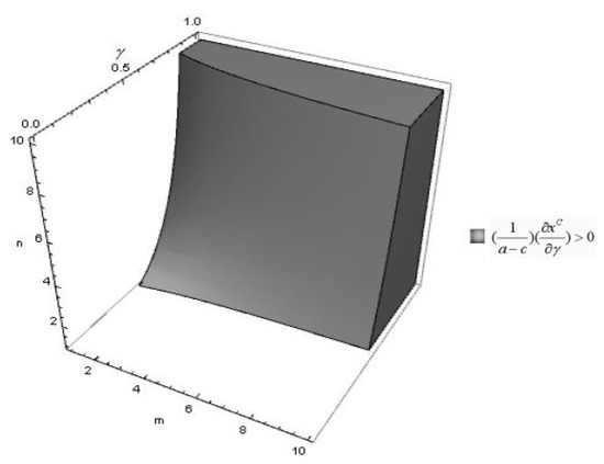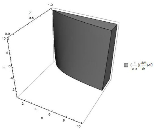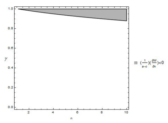 It follows from Equation (9) that the presence of more technology leaders, i.e., a higher n, decreases the R&D investment of each technology leader. Next, we show the effects of n on the aggregate R&D investments of the technology leaders. At the symmetric equilibrium, the aggregate R&D investment is . We get , where . Figure 1c shows a case with , and .