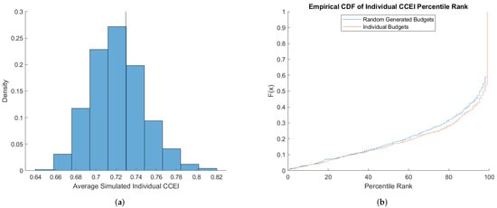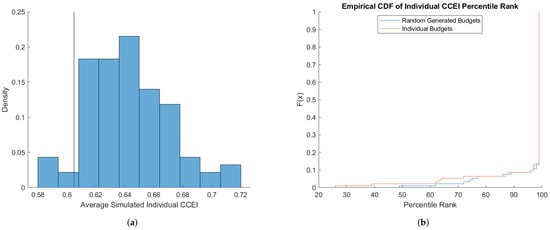 For an example of how to compare measures of choice consistency across individuals, we compute the percentile rank of choice consistency relative to the distribution generated by the individual budgets benchmark. This provides a normalization that corrects for the power of the budget sets faced by each individual and is in comparable units. By conducting the individual budgets benchmark, we effectively determine how rational an individual is relative to the benchmark power of their budget sets. An alternative method to compare across individuals is to use the measure of predictive success () proposed by Beatty and Crawford [] where r is the individual’s measure of choice consistency and a as the average measure generated by the individual budgets benchmark.