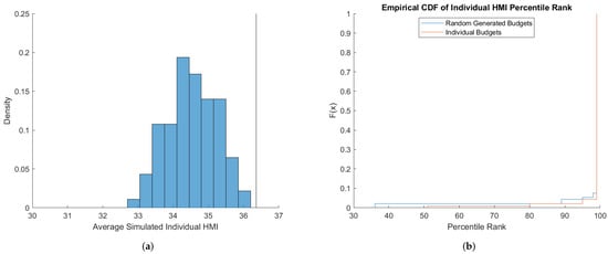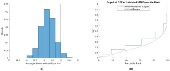 We find that the random budgets benchmark leads to bias relative to the individual budgets benchmark. Furthermore, the sign of the bias is sensitive to the measure of choice consistency. For the Choi et al. [] dataset, we observe that average CCEIs under the random budgets benchmark is lower compared to those simulated under our individual budgets benchmark. This implies that there is an upward bias when comparing the CCEIs under the random budgets benchmark. Thus, not accounting for the individual’s budgets suggests that individuals are more consistent than they are for their budgets. For HMI, we find the opposite result. Here, the average random budgets benchmark for HMI is higher than average individual budgets benchmark. Thus, using the random budgets benchmark suggests that individuals are less rational than they are relative to the budgets they faced in the experiment. Qualitatively, we observe similar results for the Choi et al. [] dataset when looking at the HMI. In contrast, for the Choi et al. [] dataset the random budgets benchmark of CCEI is almost centered around the average individual benchmarks which leads to no obvious bias.