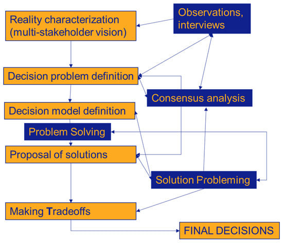 In an interactive and iterative problem, the fundamental purpose is to obtain a solution that suits the decision maker, who is, in the current case, a group of stakeholders instead of a unique individual. The procedure of problem solving needs first to identify the situation to address and the decision problem to solve, for this data collection and observation procedures are needed (as explained in Section 2.1. while presenting the case study methodology). Then, once the decision variables and problem are defined, a first model can be made, and a solution is found (problem-solving phase). After that, the suitability of this solution, then of the model, and finally of the represented decision problem need to be assessed (solution problem). To do that, both sensitivity analysis and exchange with stakeholders are included.