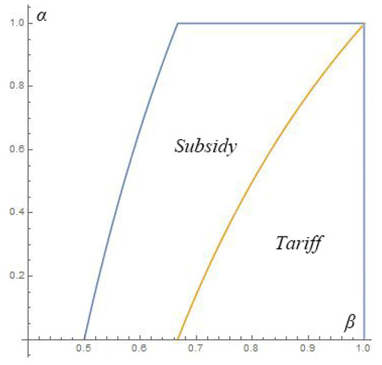 With an increasing , the consumer-friendly upstream firm emphasizes its end-customers’ welfare, and the wholesale price is lowered through bargaining, i.e., , leading to a lower tariff rate for the foreign upstream firm.
