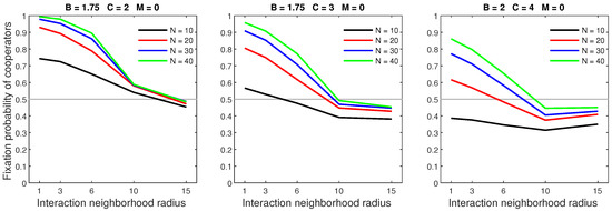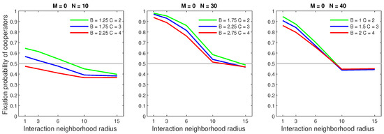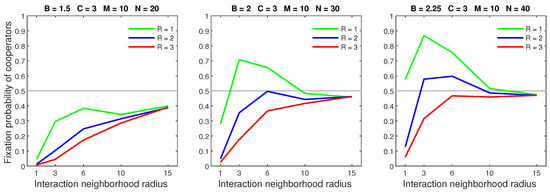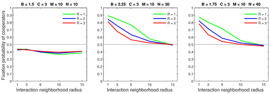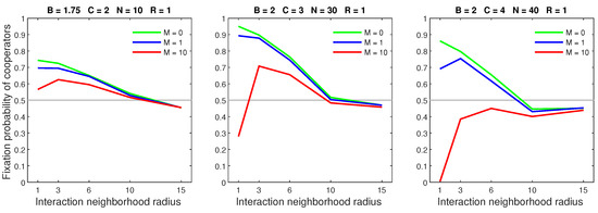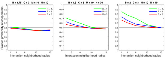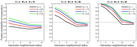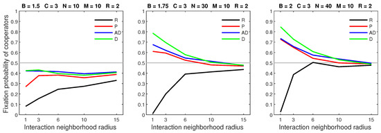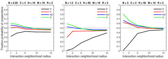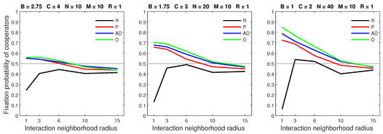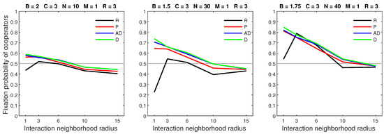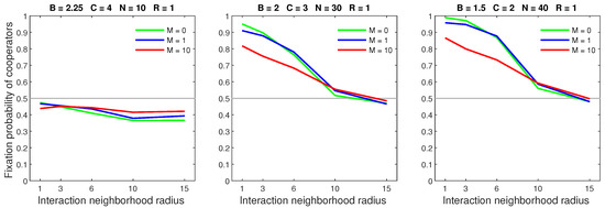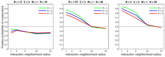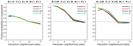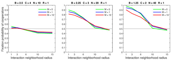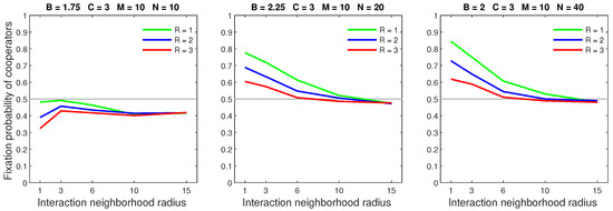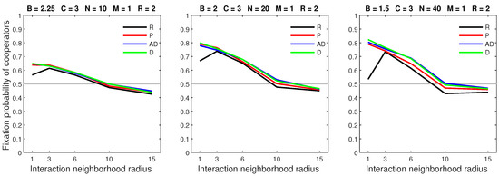 We analysed the impact of increasing the dispersal range while fixing the cost at the central value (). We generally observed that the initial increase in dispersal range (from to ) caused the largest drop in the fixation probability. The subsequent increase in dispersal range (from to ) generally incurred a smaller penalty on cooperators. Increasing the dispersal range was particularly harmful to cooperators in settings with a high population density or a small interaction neighborhood radius.