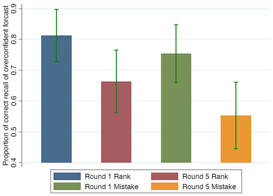 We find that when recalling whether they were overconfident in Round 1 forecasts (rank), 82% of the overconfident subjects can recall correctly, which is not significantly different from the percentage observed for underconfident subjects. Similarly, the proportion of correct recall on overconfidence in Round 1 (number of mistakes) is not significantly different between overconfident and underconfident subjects. A similar pattern is found for Round 5 rank and mistake. Taken together, these results suggest that good news (i.e., the actual outcome being better than the forecast) is not recalled more accurately than bad news. Relatedly, Zimmermann (2020) [12] finds that positive feedback has a persistent effect on beliefs, whereas the effect of negative feedback is more short-run in nature, and subjects recall it with less accuracy. Conditional on individuals’ overconfidence or underconfidence, we find that individuals choose to misremember according to their confidence type rather than necessarily misremembering bad news more than good news.
