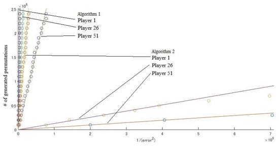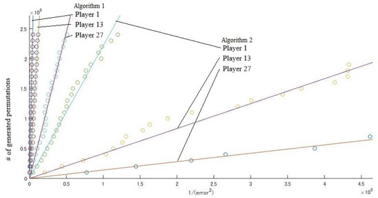 We tested the EU Council instance and the United States instance described in the previous section. In each instance, we set M in Algorithms 1 and 2 (the number of generated permutations) to . For each value of M, we executed Algorithms 1 and 2 100 times. Figure 2 and Figure 3 show the results of some players. For each value of M, we calculated the mean number of , denoted by , in an average of 100 trials. The horizontal axes of Figure 2 and Figure 3 show the value . Under the assumption that , we estimated by the least squares method. Table 2 shows the results and ratios of of the two algorithms.