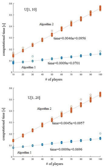 For each (generated) permutation, the computational effort of both Algorithms 1 and 2 are bounded by . Here, we discuss the constant factors of computations. We tested the cases where weights are generated uniformly at random from the intervals or , and the quota is equal to . For each , we executed Algorithms 1 and 2 by setting M = 10,000. Under the assumption that computational time is equal to , we estimated a and b by the least squares method. Figure 4 shows that for each permutation, the computational effort of Algorithm 2 increases about five-fold compared to Algorithm 1.