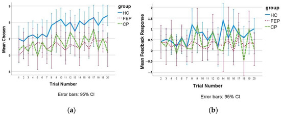 Figure 1. Development of (a) Mean Investments per Group over Trials, and (b) Mean Trial-by-Trial Feedback Response, with Error Bars.HCs: healthy controls; FEPs: first-episode psychosis patients; CPs: chronic psychosis patients.