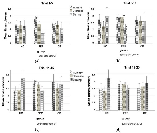 As a data check, and a justification for the method, we inspected the individual data for investment patterns, and analysed changing behaviour, dividing the 20 trials in 4 blocks of 5 trials (analogous to [35]). There were differences in the number of changes in direction (from increase to decrease and vice versa, disregarding staying at the same number) between groups (F(2181) = 4.08, p = 0.018), with FEPs showing significantly more jumps (p = 0.014) than HCs. Furthermore, the times the number 10 was chosen differed per group (F(2181) = 3.90, p = 0.022), with FEPs choosing 10 significantly less than HCs (p = 0.03). CPs did not differ significantly from either group. Trial-by-trial analysis including staying behaviour, divided into 4 blocks of 5 trials (see Figure 2) showed that increasing investments only differed marginally between groups (blocks 1 and 3: HCs < FEPs p = 0.05 and 0.07, respectively), but differences were significant for decreasing and staying behaviour, however, only between HCs and FEPs. CPs did not significantly from either group in any condition. In the second block of 5 trials, FEPs decreased more (p = 0.002) and stayed less (p = 0.02) than HCs. In the third block, FEPs stayed less (p = 0.02) than HCs, and in the last block, FEPs decreased more and stayed less than HCs (both p’s = 0.04).