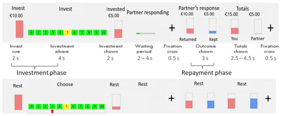 Figure 3. Visual representation of the trust game. Note. A depiction of the stimuli given in the trust game is shown, with above the experimental trials, and below the control trials, which are disregarded in this paper. Used with the permission of Lemmers-Jansen, Fett [27], who performed this study in the Netherlands, hence the currency in Euro’s (€) and not in Pounds (£).
