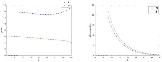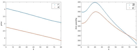 Demand for certain innovative products is built-up as time goes by through the word-of-mouth effect (see [,]). In our model, this network effect, like other externalities is embedded in the demand function via time-dependent functionals. Unlike previous examples, in Example 5, we consider a time-dependent price cap, based on the Bass diffusion model for new-product-adaption: Initially, the price cap is increasing with time, reflecting the customers’ gradually increasing willingness to purchase as time goes by (hence a decreasing sensitivity to prices). Again, we use a simple Cobb–Douglas function for the demand mean functional: . , , , , , , .