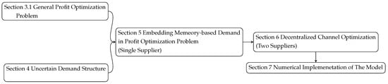 While this article should be regarded as a methodology paper, in Section 7, we provide examples of decision-making problems using our model. It is important to emphasize that the simplified demand functionals offered in this section are merely illustrative and not, for instance, the results of empirical studies. Through these examples, we will see how the model can be implemented in strategic games where the parties must balance immediate profits with future earnings. Among the scenarios in this section, we analyze a special case wherein the two suppliers integrate to form a centralized channel (Section 7.2). The diagram of section dependency can be found in Scheme 1.