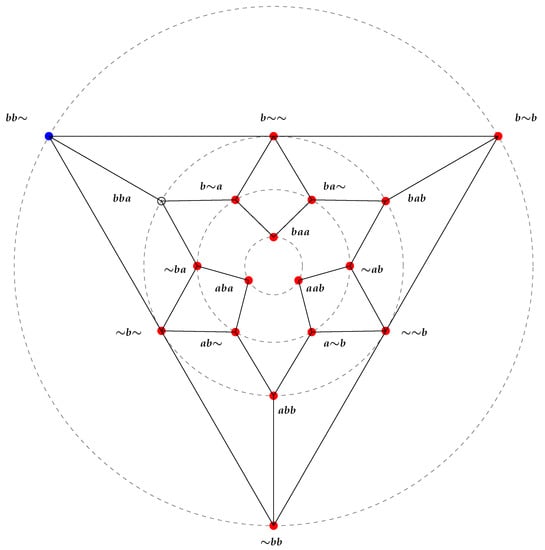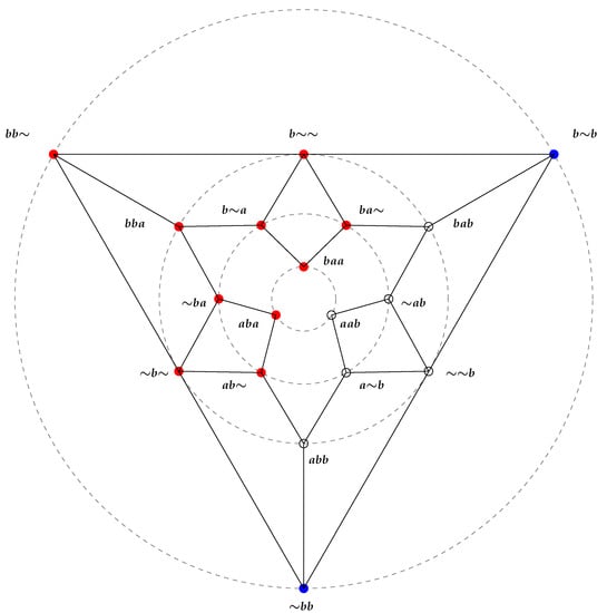 If two of the three vertices on the largest circle are red and the third one is blue, necessarily all but one of the remaining vertices will be red. The value on what is left can be assigned either red or blue in any case preserving strategy-proofness. So, this example really deals with six different SP functions. Consider, to fix ideas, the case , in the next Figure 1. The value a has to be assigned to all profiles except for which the value of cannot be fixed. We can color it red () or blue ().