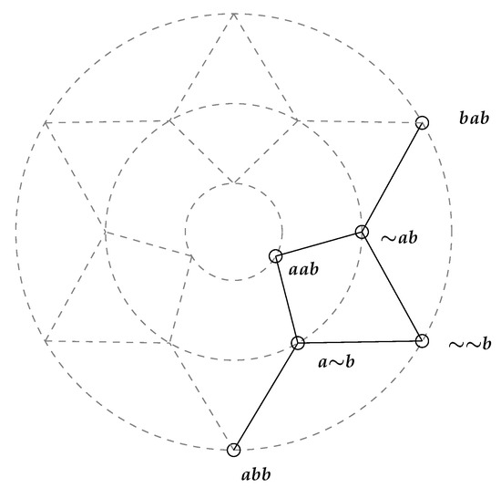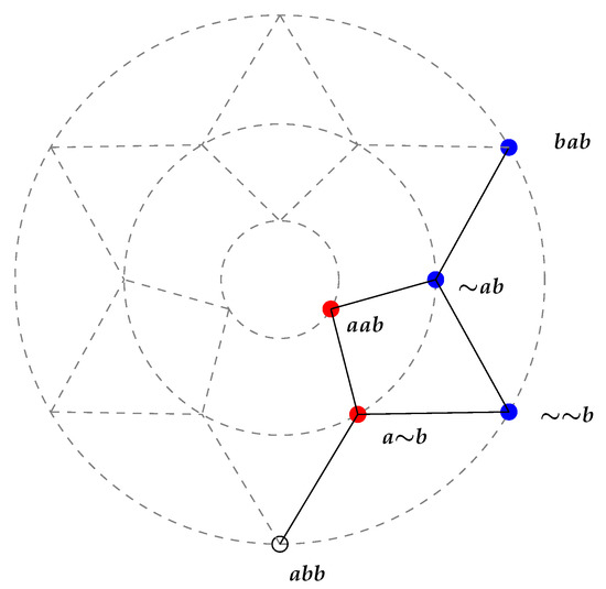 Let us fix the ideas with the case that the value of is b on exactly two vertices of the smallest circle (only ). The values of remain not fixed on three uncolored profiles (see Figure 7). Differently from the last two cases (of Figure 4 and Figure 5), this time, clearly, not all the () possibilities are allowed. Only five (obvious) assignments give rise to an SP function (Theorem 1).