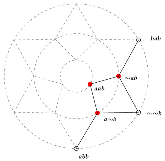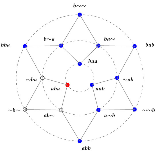 If there is exactly one red vertex on circle 4 (in the next Figure 2 we assume, to fix ideas, that and ), then six of the remaining profiles remain uncolored, i.e., the value of is not assigned. However, those blank vertices cannot be colored arbitrarily in order to represent an SP function.