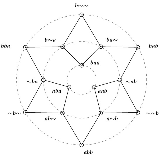 The edges of as a graph are the pairs of profiles joined when one covers the other. To provide an intuitive view of , we conveniently draw four concentric circles numbered from 1 to 4 according to increasing rays (1 is the smallest, 4 is the biggest), and set the vertices (i.e., the eighteen profiles of ) on the circles according to the following rule: