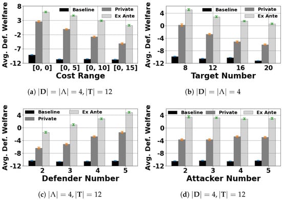 Average defender social welfare: the defenders’ cost range is fixed to in sub-figures (b–d).