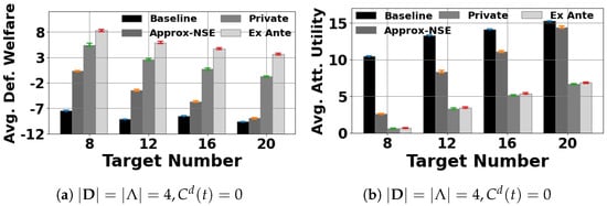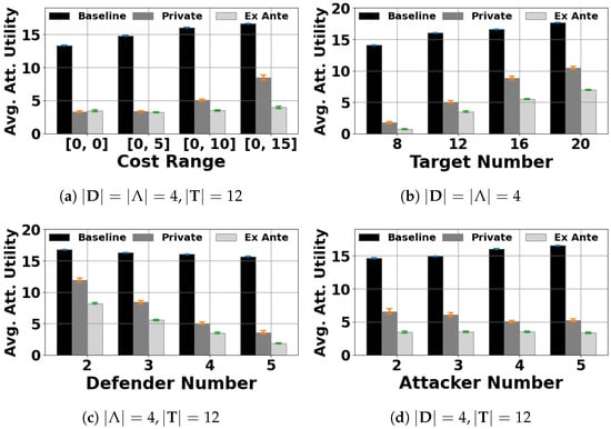 Average attacker utility: the defenders’ cost range is fixed to in sub-figures (b–d).