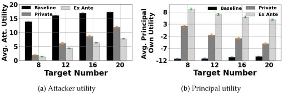 In Figure 4, we examine the situation in which the principal attempts to maximize her own utility (given she is one of the self-interested defenders). We again observe that the attacker suffers a significant loss in utility compared to (Figure 4a, and versus ). Conversely, the principal can get a significant benefit by strategically revealing her private information through the signaling mechanisms (Figure 4b).