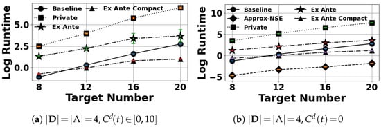Figure 5 shows the logarithm runtime of our algorithms compared to and . We observe that our algorithms ( and ) are suitable for medium games. In Figure 5a, it takes and approximately 23 min and 40 s, respectively, to solve 20-target games. Furthermore, our compact representation method () helps solve the signaling scheme significantly faster. It only takes approximately 2.7 s to solve 20-target games.