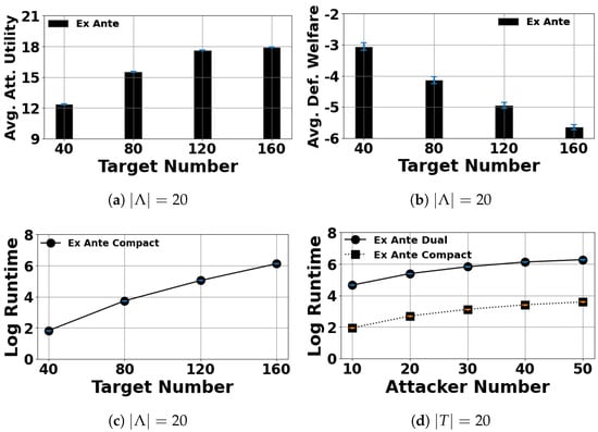 Finally, we examine the performance in the ex ante case with a large number of targets or attacker types in Figure 6. Our algorithms can easily scale to about 160 targets, which is a large improvement compared to previous works [37,38]. We remark that it is typically impossible to test running time for such complicated security games for more than 200 targets on a single machine (most real-world applications such as conservation area protection or border protection have fewer than 200 targets as well). For a large number of attacker types, our experiments show that the running time dependence of our algorithm with respect to the number of attacker types is linear, which is extremely efficient.